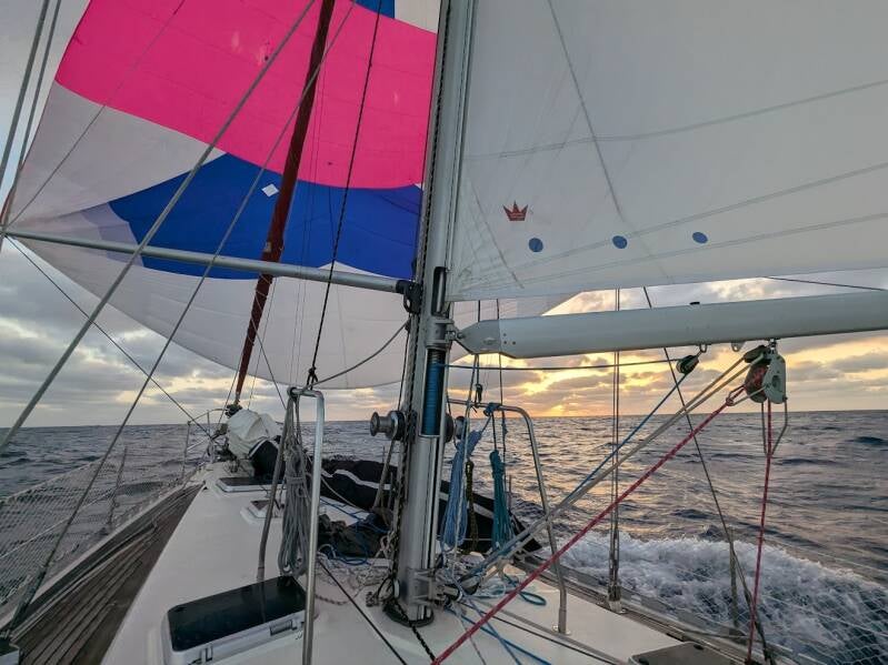 Dès la sortie du port on est dans le bain : la mer est formée… Voiles envoyées, c’est parti pour plusieurs jours ! 19h30, premier couché de soleil : toujours aussi magique. Nous organisons nos quarts de nuit. Je reprends le 22h-1h. Alex suit de 1h à 4h. Marguerite termine la nuit de 4h à 7h. Nous allons devoir être vigilants, dans cette zone nous pouvons croiser la route d’embarcations qui n’apparaissent pas à l’AIS et faiblement éclairées. Une petite chute du vent nous oblige à faire 3 heures de moteur en fin de nuit. Dans la matinée, le vent s'établit autour de 15 nœuds au portant, idéal pour envoyer le spi (la voile préférée d’Alex). On le garde toute la journée du jeudi et encore toute la journée du vendredi. Le bateau nous surprend par sa réactivité au portant : on file et compte tenu de la mer, ça reste confortable ! Nous ne rencontrons pas de problème majeur si ce n’est la cloche de tangon qui a lâché en pleine nuit (entre vendredi et samedi). Réveil en sursaut par un grand boum sur le pont ; Alex saute de son lit et bricole rapidement une cloche provisoire avec une manille textile : on peut renvoyer le génois à contre! La vie à bord se passe bien : un peu d'école, des bons petits plats, des jeux de société et la lecture.