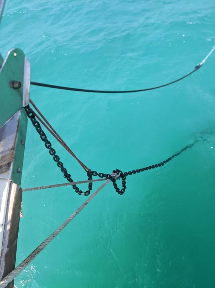Le vent se lève sur le mouillage, accompagné d’une belle houle… Les bateaux commencent à danser. Tout le monde plonge pour vérifier son ancre. Vers 16h, sous la pression vent/vague/courant la main de fer de notre mouillage saute. Avec Paul, on la remet rapidement afin de soulager le guindeau qui n’arrive pas à maintenir la chaîne (à ce moment-là, Alex fait de la planche). Alex rentre, la main de fer saute à nouveau. Par sécurité, on décide d'envoyer dix mètres de chaîne supplémentaires. On replace la main de fer. Et là, Paul voit que deux mailles sous la main de fer il y a une maille cassée qui s’ouvre à vue d'œil. Pas de panique mais si elle décroche, on sera bon pour plonger chercher l’ancre et les trente mètres de chaîne qui l’accompagnent tout en dérivant sur les bateaux des copains. Rapidement, on passe une écoute de spi sous la maille cassée pour pouvoir reprendre un peu de chaîne et repositionner la main de fer. Paul trouve une manille de la bonne taille pour remplacer la maille cassée (suffisamment grosse pour tenir sous l’effort et pas trop non plus pour passer dans le guindeau quand on voudra partir). Par sécurité, on sort notre mouillage de secours (ancre + bout plombé : tout neuf). Alex, aidé de Laurent et Mathieu, les copains bretons, part la positionner en parallèle de celle déjà en place !