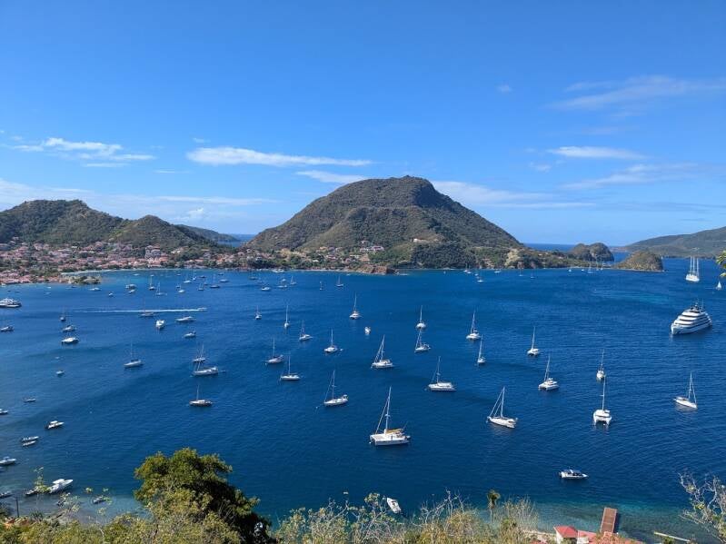 Après 3 semaines passées en Dominique sans que le bateau ne quitte la bouée, au lever du jour, nous faisons cap sur la Guadeloupe. Nous allons retrouver des bateaux copains aux Saintes pour quelques jours. Vingt nœuds établis au travers, deux ris dans la GV, une petite houle et le soleil… ça tartine ! On rejoint les Saintes en quelques heures juste avant les bateaux charter pour pouvoir attraper une bouée près de la plage !
