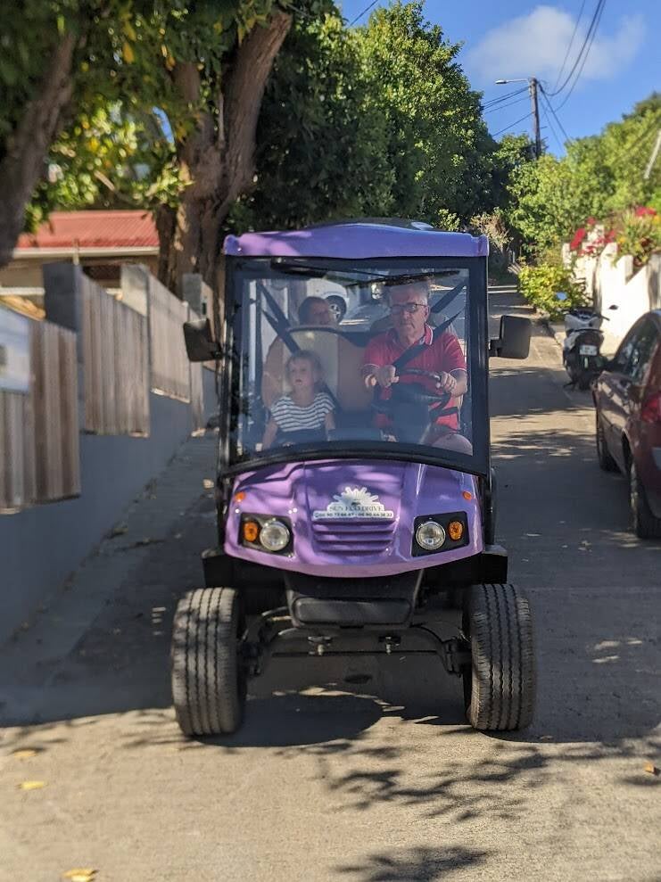Dimanche 9 mars, nous quittons Marie Galante pour les Saintes. L’arrivée dans l’archipel, sous le soleil et le ciel bleu, est magnifique. Nous découvrons de nouveaux endroits de Terre de Haut et mangeons “encore” de délicieux accras. Les cousins viennent de Marie-Galante pour une journée sur Terre de Haut. Ils arrivent à 9h30 et repartent à 15h. Pour voir un maximum de choses, ils louent des voiturettes. La location allant jusqu’à 17h, nous en profitons pendant 1h30. C’est l’occasion d’aller voir les coins que nous n’avions pas visité lors de notre dernier passage.