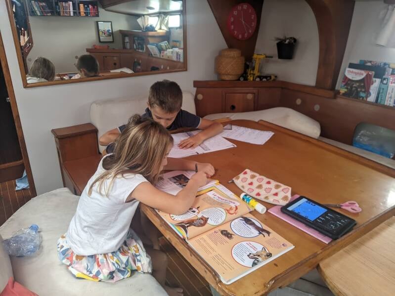 L’ambiance est toujours bonne à bord. Les enfants dorment bien malgré les conditions ; nous un peu moins. On ressent l'inconfort lié au mouvement, l'accélération du bateau qui descend les vagues (on fait des surfs à 12 nœuds) et on reste à l'affût de bruits anormaux. Bref, la nuit, on veille plus qu’on ne dort. Dans la journée, on garde un rythme autour des repas, du travail scolaire et des siestes… c’est important pour tous.